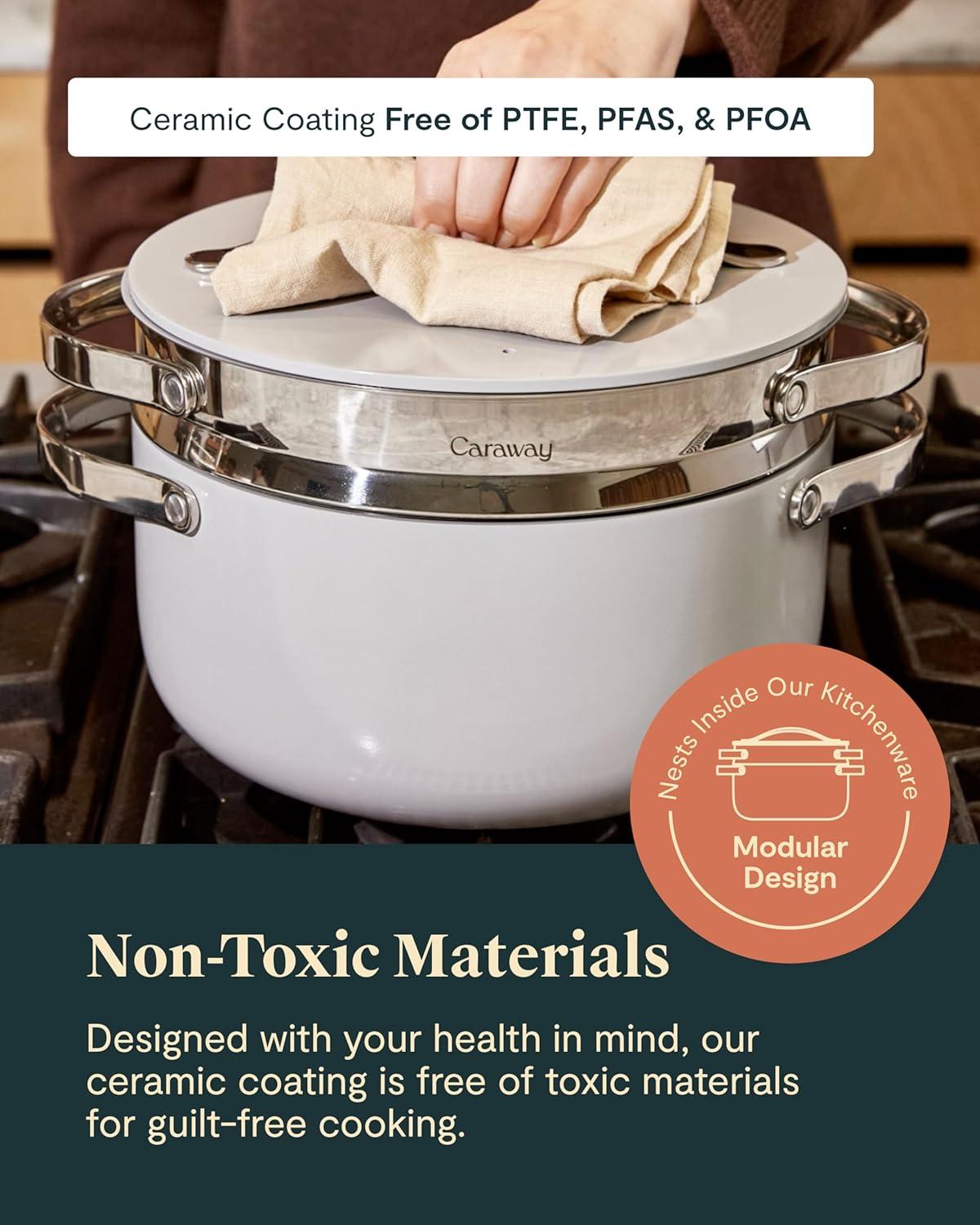 NON-TOXIC COATING: All Caraway pot and pan products are free of PTFE, PFOA, PFAS, lead, cadmium and other toxic materials that can leach into your food, making them safe for you, your family and the environment.