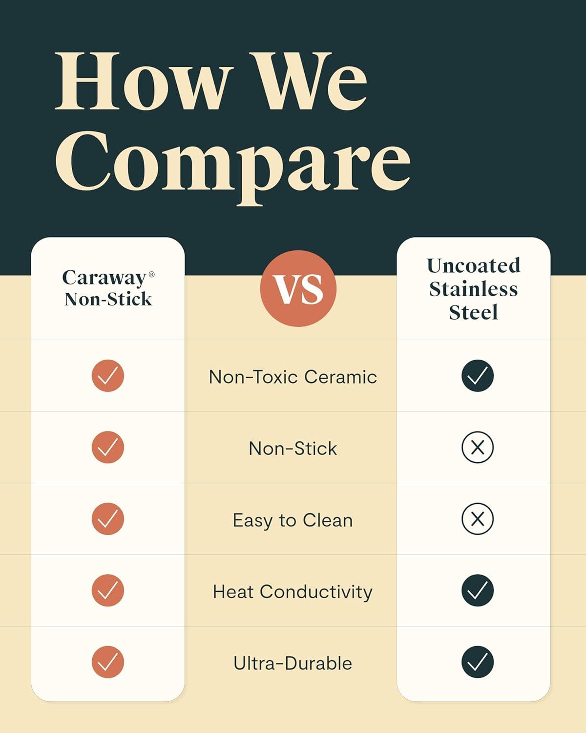 NON-TOXIC COATING: All Caraway pot and pan products are free of PTFE, PFOA, PFAS, lead, cadmium and other toxic materials that can leach into your food, making them safe for you, your family and the environment.