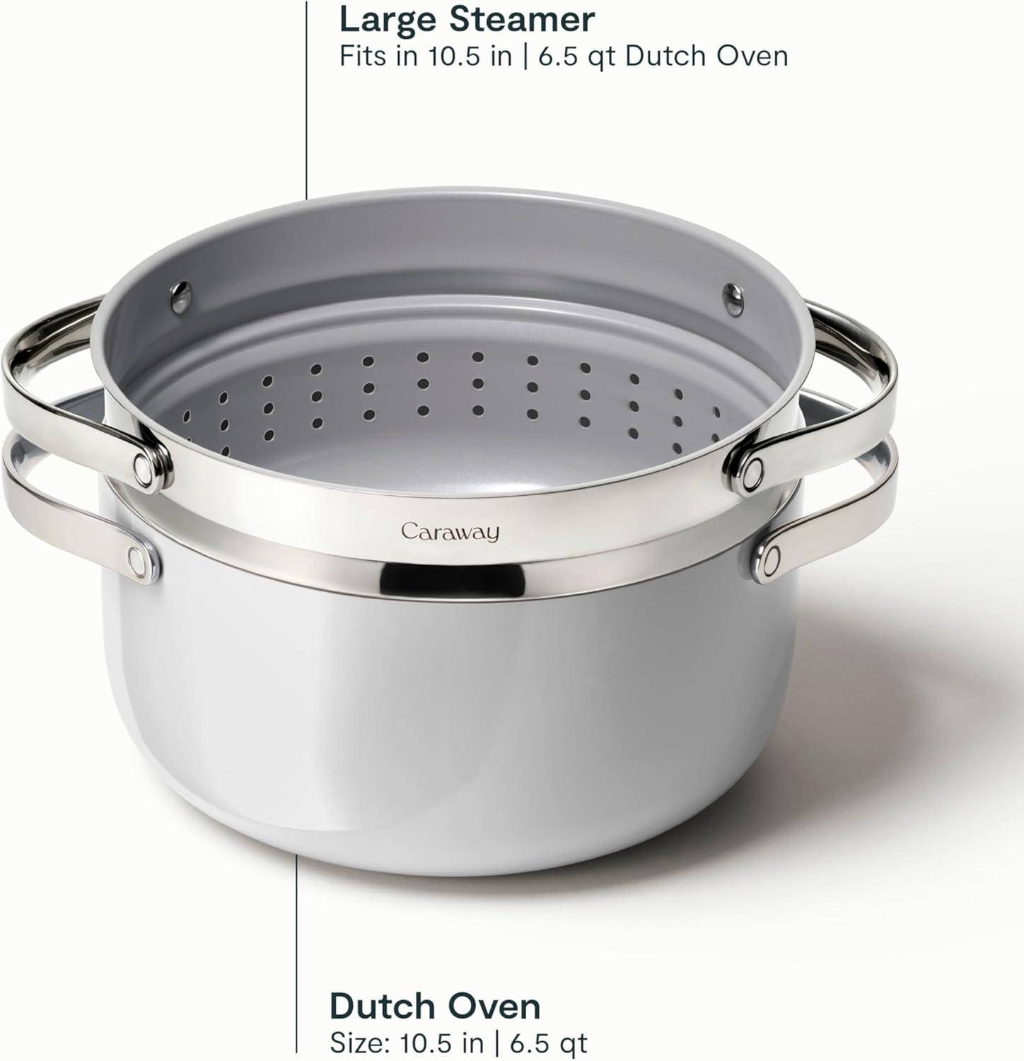 Caraway Nonstick Ceramic Dutch Oven Pot with Lid & Steamer (6.5 qt, 10.5″) – Non Toxic, PTFE & PFOA Free – Oven Safe & Compatible with All Stovetops (Gas, Electric & Induction) – White(White)